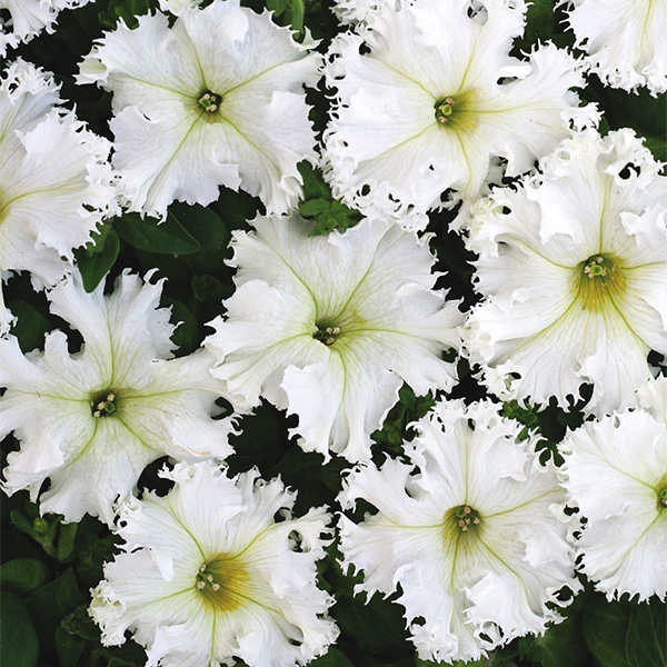 Крупные цветки белой окраски с волнистыми и бахромчатыми краями диаметром 8 см, растения высотой 35 см. Сорт особенно пригоден для посадок в горшки и ящики.