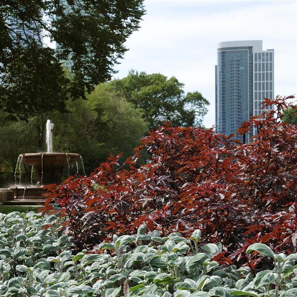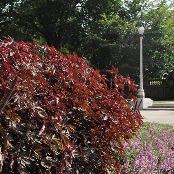 Стройный густой кустарник. За сезон в благоприятном климате способен вырастать до 90-150 см в высоту и до 75 см в ширину. Имеет действительно великолепные темно-бордовые лопастные листья с городчатыми волнистыми краями, ради которых и выращивается. Цветки немногочисленные, винно-красные, крупные, но обычно растение у нас не цветет. Сорт сочетает в себе солнцелюбивость и высокую жаростойкость. В то же время, может расти на берегу пруда и даже на небольшом мелководье. Подходит для городского озеленения, устойчив к атмосферным загрязнениям. Важно: листва будет иметь рыжевато-зеленые тон в теплице, но созреет до бордового на открытом солнце.